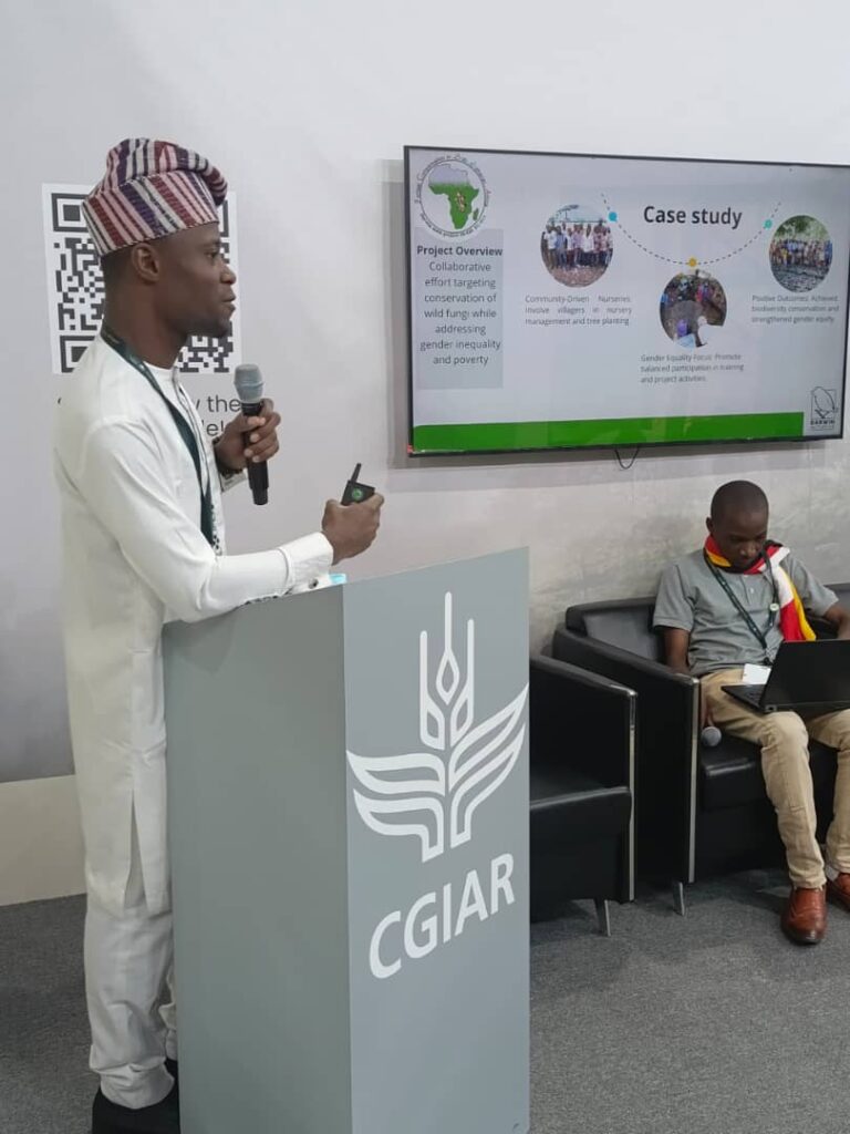 Wilfrid, a member of the Fungal Conservation in Sub-Saharan Africa (FC-SSA) Project, recently participated in the 16th Conference of Parties (COP16) held in Riyad, Saudi Arabia. During a side event organized by CGIAR, Wilfrid delivered a compelling presentation on “What are some practical ways to ensure marginalized communities have a genuine voice in the planning and decision-making of restoration projects?”