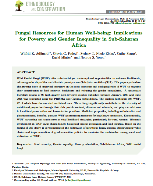 Our new article presents the first large-scale synthesis on the role of wild useful fungi (WUF) in Sub-Saharan Africa. From 95 scientific papers, we identified 396 fungal species, including 47 with medicinal uses. These fungi are rich in proteins, vitamins, and minerals, contributing significantly to nutrition, food security, and traditional healthcare. Economically, WUF harvesting and trade mostly led by rural women provide essential income that supports families’ food, education, and health needs. However, challenges like deforestation, under-documentation, and gender inequality threaten their sustainable use. The study calls for inclusive policies, cultivation programs, and value chain strengthening to unlock fungi’s full potential for sustainable development.